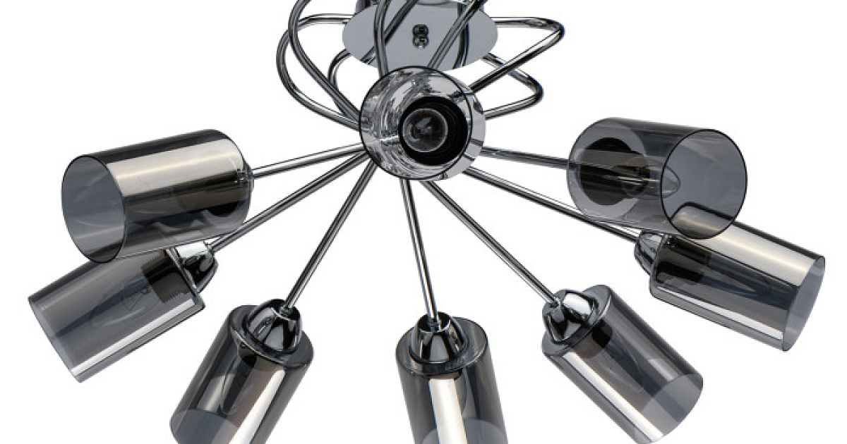 Основание светильника выполнено из металла и гальванизировано в цвет хрома. Стеклянные плафоны гальванизированы в дымчатый цвет.