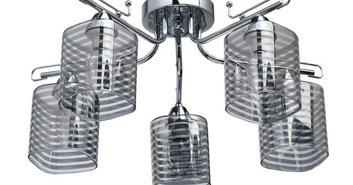 Металлическое основание гальванизировано в цвет хрома. Стеклянные плафоны гальванизированы в дымчатый цвет по трафарету в полоску.
