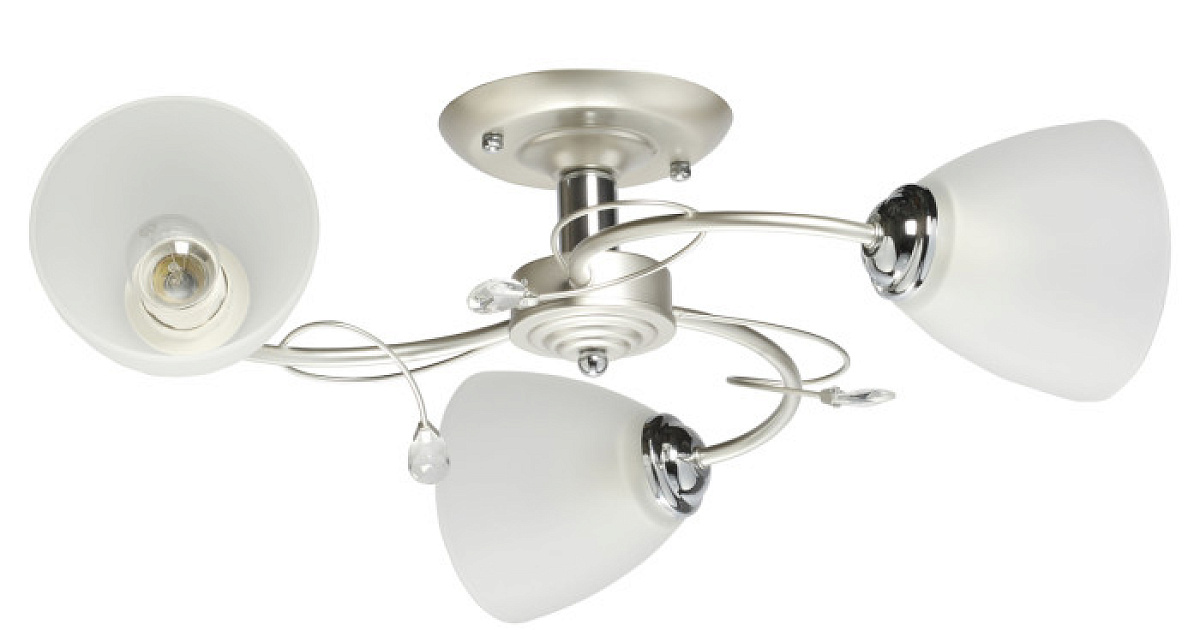 Основание светильника выполнено из сплава металла и окрашено в цвет перламутрового серебра. Отдельные элементы основания гальванизированы в цвет хрома. Светильник декорирован стеклянными матированными плафонами и прозрачным хрусталем.