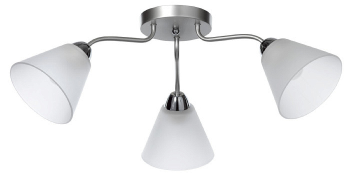 Основание светильника выполнено из металла и окрашено в цвет перламутрового серебра. Отдельные элементы основания гальванизированы в цвет хрома. Светильник декорирован стеклянными матированными плафонами.