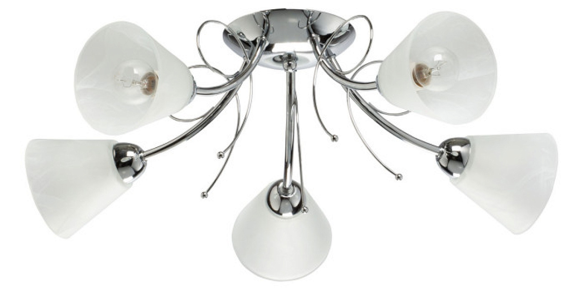 Металлическое основание светильника гальванизировано в цвет хрома. Светильник декорирован плафонами из алебастрового стекла.