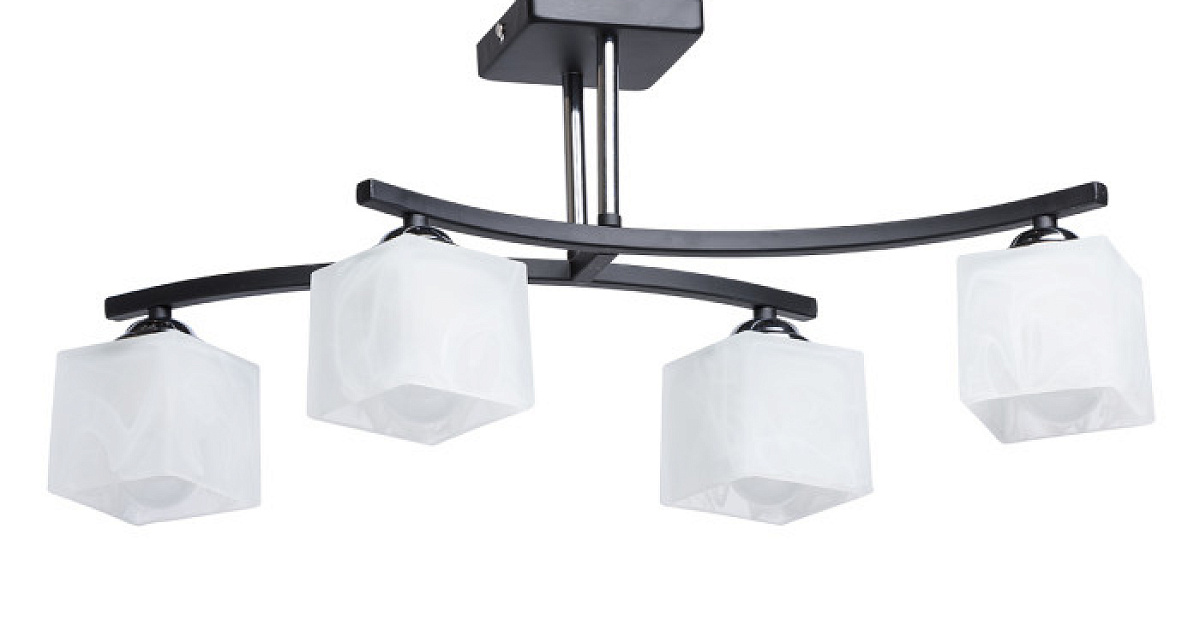 Арматура выполнена из сплава железа и окрашена в черный цвет. Штанги гальванизированы в цвет хрома. Светильник декорирован плафонами из матированного стекла, окрашенного в белый цвет с добавлением алебастра.