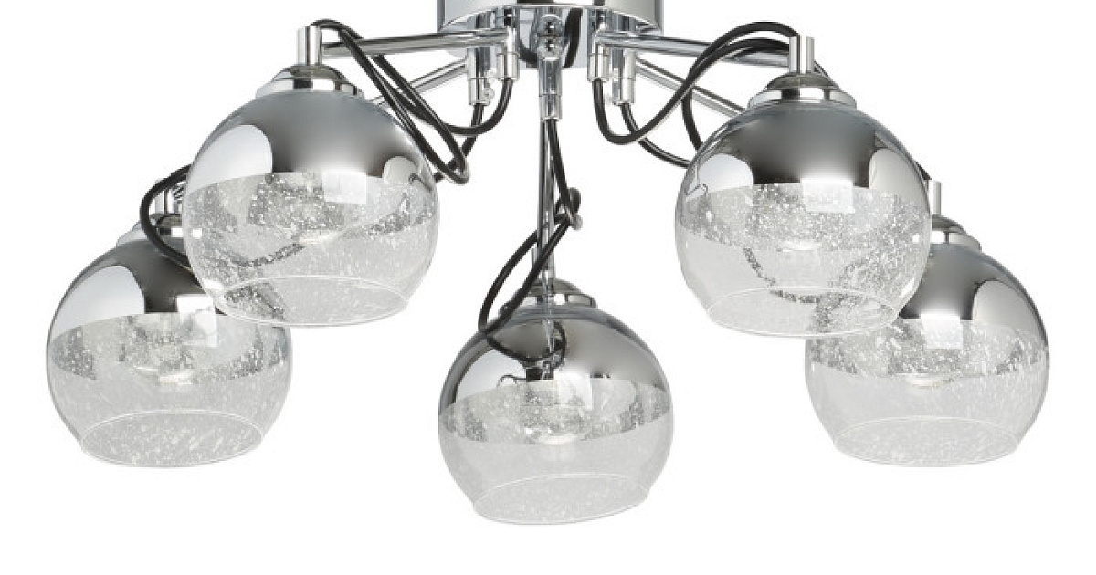 Светильник декорирован стеклянными плафонами, гальванизированными у основания в цвет хрома.
