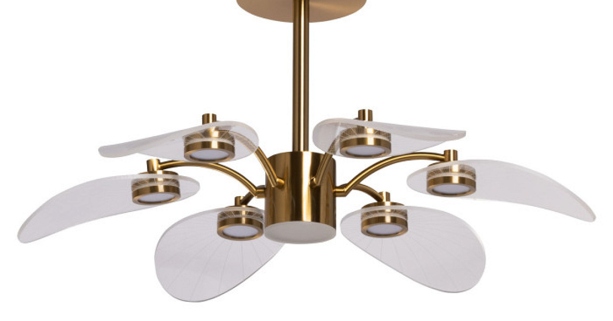 Цвет латуни прекрасно сочетается с современными формами и материалами. Светодиодные источники света закрыты прозрачным многогранным акрилом, создающим эффект красивой игры бликов света. Многорежимность освещения от 3000К до 6000К позволяет подобрать комфортную температуру света. Диммирование поможет выбрать необходимую интенсивность светового потока, а ПДУ обеспечит удобную эксплуатацию люстры. Качественные светодиоды экономичны и безопасны.