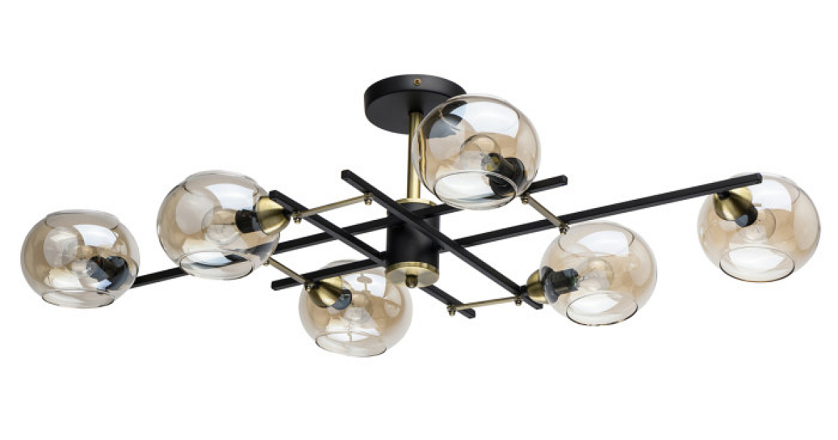 Основание светильника выполнено из металла и окрашено в черный цвет. Отдельные элементы основания гальванизированы в цвет латуни. Светильник декорирован стеклянными плафонами оригинальной формы, гальванизированными в цвет шампань.