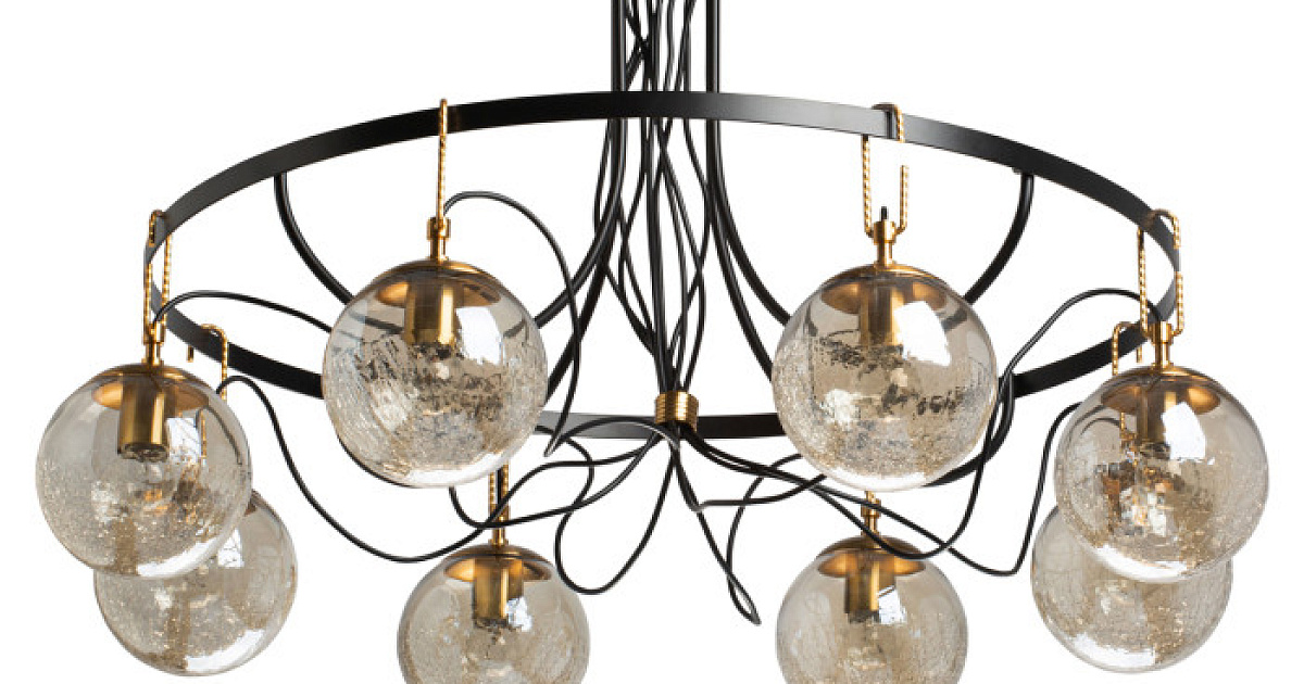 Металлическое основание светильника окрашено в черный цвет. Отдельные элементы основания гальванизированы в цвет медовой бронзы. Держатели плафонов выполнены по технологии твист. Светильник декорирован стеклянными плафонами, гальванизированными в цвет шампань. Плафоны частично кракелированы.