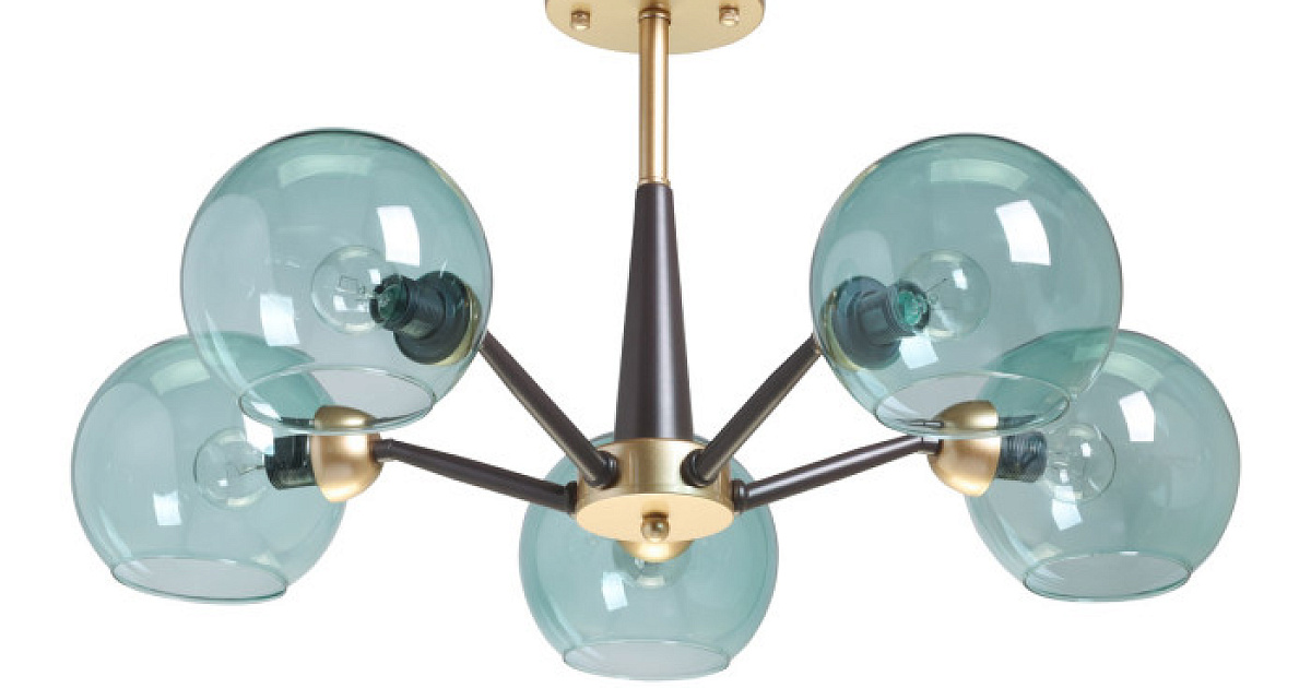 Металлическое основание подвесной люстры гальванизировано в цвет матового золота. Отдельные элементы основания окрашены в темно-коричневый цвет. Стеклянные плафоны окрашены в массе в зелено-голубой цвет и выдуваются вручную в форму. Края плафонов оплавлены.
