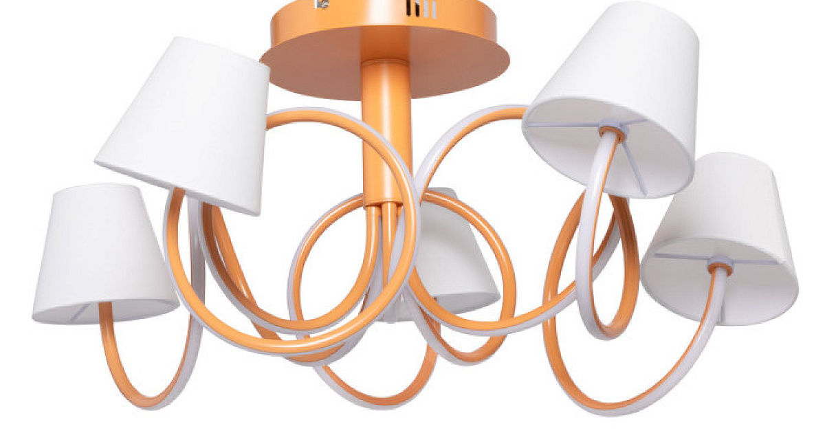 Металлическое основание потолочной люстры окрашено в терракотовый цвет. Корпус плафонов изогнутой формы выполнен из сплава алюминия с цинком и окрашен в цвет основания. Двухслойные абажуры состоят из текстиля белого цвета и термостойкого акрила с внутренней стороны. Абажуры прошиты. Светодиодные источники света закрыты белым силиконом.