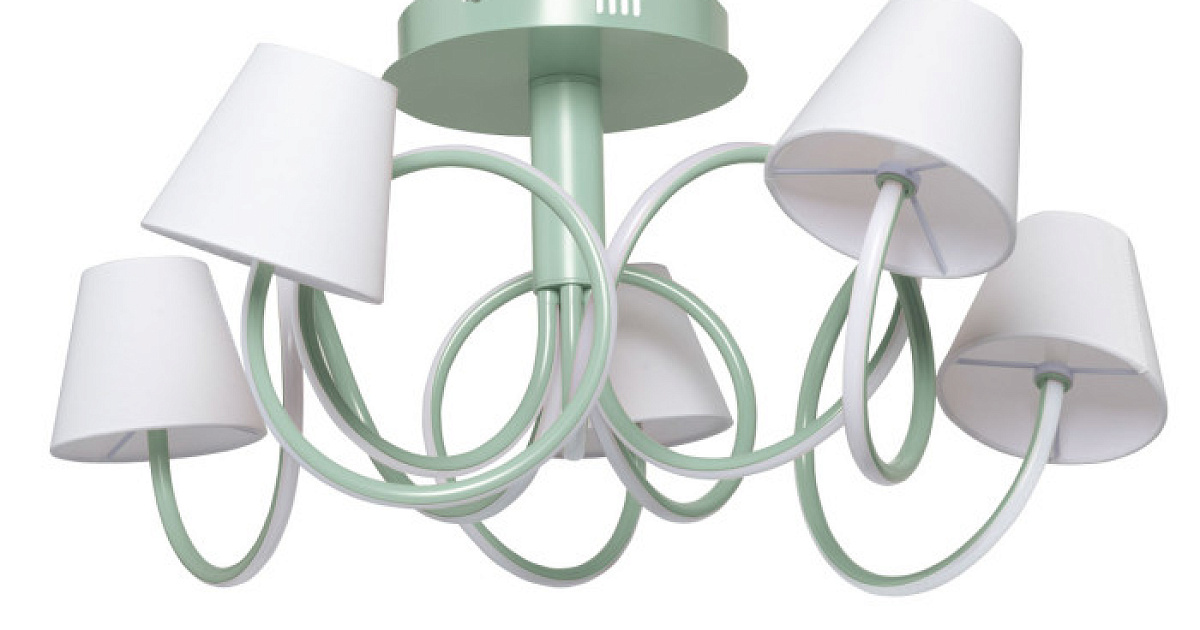 Металлическое основание потолочной люстры окрашено в зеленый цвет. Корпус плафонов изогнутой формы выполнен из сплава алюминия с цинком и окрашен в цвет основания. Двухслойные абажуры состоят из текстиля белого цвета и термостойкого акрила с внутренней стороны. Абажуры прошиты. Светодиодные источники света закрыты белым силиконом.