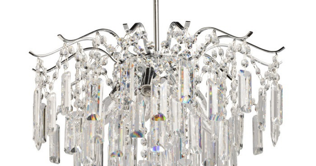Металлическое основание потолочной люстры гальванизировано в цвет хрома. Светильник декорирован прозрачным хрусталем разной формы.