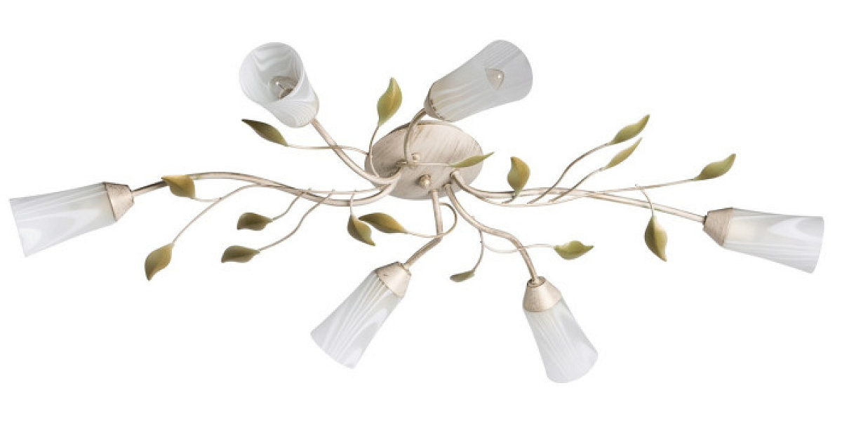 Основание: металл, окрашивание по технологии хай-лайт, основной цвет - белый, декоративный слой цвета золота. Рожки и завитки выполнены по технологии проката на роликовом станке. Плафоны: стекло отлитое в форму, матирование, ручное окрашивание по поверхности. Декор: растительные элементы из металла, окрашивание в салатовый цвет.