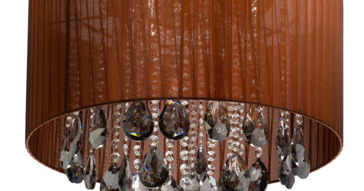 Металлическое основание светильника гальванизировано в цвет хрома. Потолочная люстра декорирована текстильным абажуром из органзы коричневого цвета и хрусталем высокого качества прозрачным и гальванизированным в дымчатый цвет.