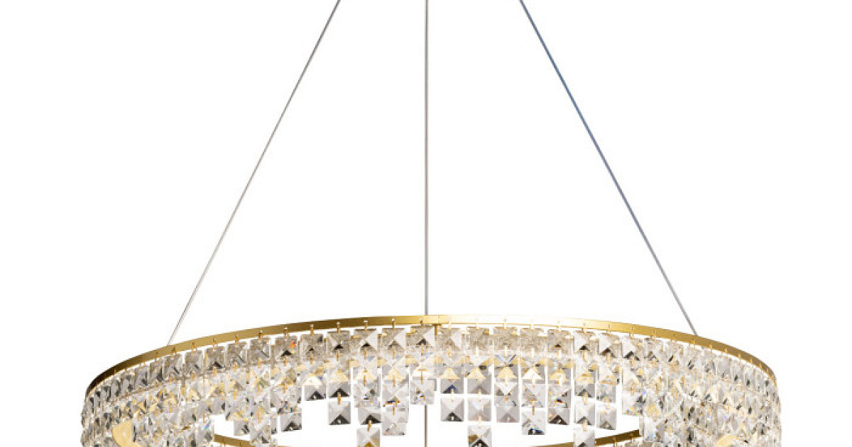 Металлическое основание подвесной люстры окрашено в цвет матового золота. Люстра декорирована прозрачным хрусталем квадратной формы.