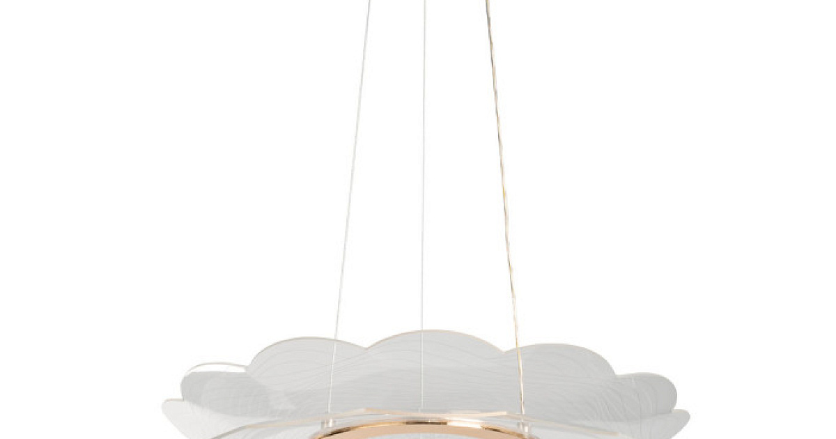 Металлическое основание подвесной люстры окрашено в черный цвет. Корпус плафона выполнен из сплава алюминия и гальванизирован в цвет золота. Люстра декорирована прозрачным акрилом с рисунком оригинальной формы.