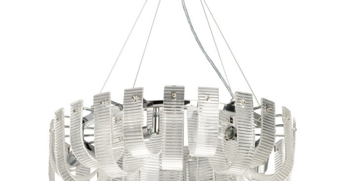 Металлическое основание люстры гальванизировано в цвет хрома. Плафон выполнен из прозрачного фактурного стекла.