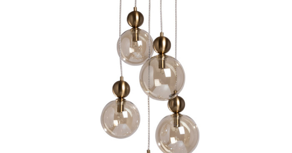 Металлическое основание подвесной люстры гальванизировано в цвет медовой бронзы. Источники света закрыты стеклянными плафонами, гальванизированными в цвет топаза.