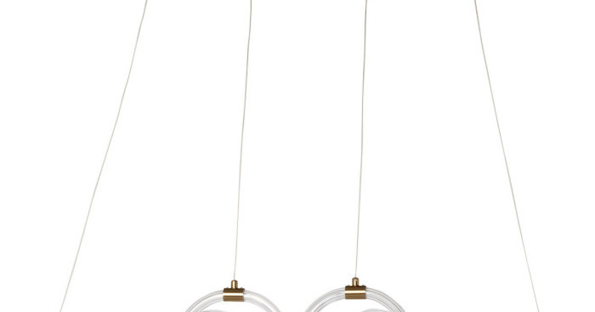 Металлическое основание подвесной люстры гальванизировано в цвет латуни. Светодиодные источники света закрыты белым матовым силиконом, заключенным в плафон из прозрачного акрила с линейным рисунком.