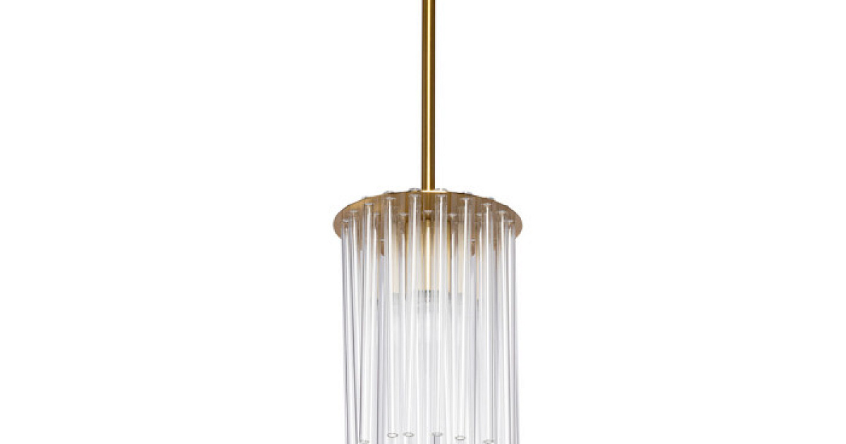 Металлическое основание подвесной люстры гальванизировано в цвет латуни. Светильник декорирован прозрачными стеклянными трубочками.