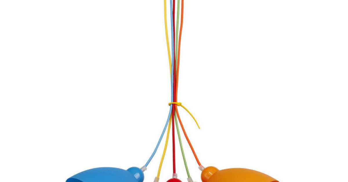 Основание светильника выполнено из сплава металла и гальванизировано в цвет хрома. Плафоны из разноцветного акрила крепятся на шнурах, аналогичных по цвету соответствующим плафонам.
