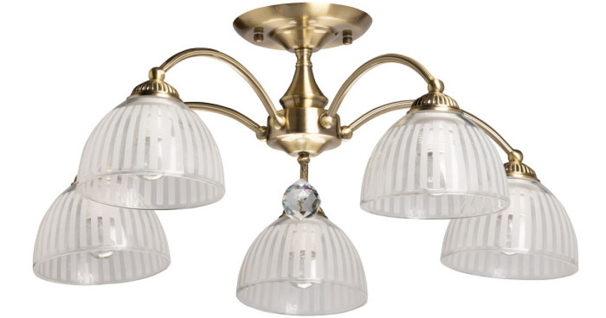 Металлическое основание потолочной люстры гальванизировано в цвет античной бронзы. Люстра декорирована плафонами из прозрачного стекла, матированного по трафарету.