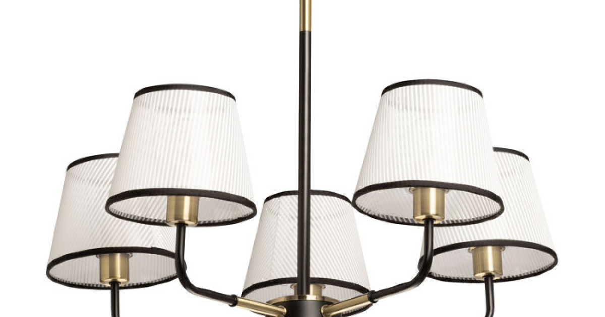 Основание светильника выполнено из металла и окрашено в черный цвет, отдельные элементы гальванизированы в цвет античной бронзы. Белые тканевые абажуры украшены линейным рисунком и имеют внутри термостойкий акрил. Края абажуров отделаны черным кантом и прошиты.