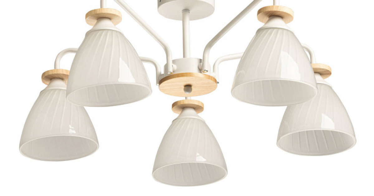 Благодаря простому и универсальному дизайну, эта люстра может быть использована в различных типах интерьеров, от современных до классических.А белый цвет придает особую утонченность и элегантность. Особый шарм создают белые стеклянные плафоны с лаконичным орнаментом, направленные вниз. Натуральности и теплоты в интерьер добавляют декоративные элементы из натурального дерева. Компактный размер люстры прекрасно подходит в интерьеры со стандартным потолком. Заменяемые источники света удобны в эксплуатации.