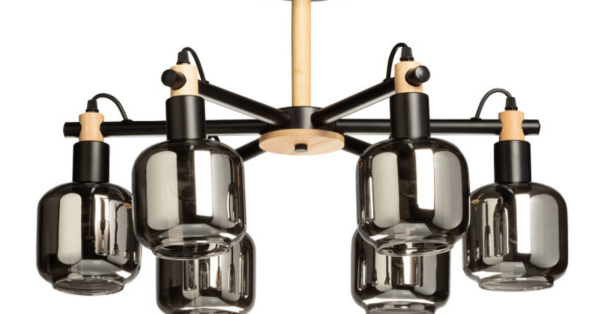 Металлическое основание потолочной люстры окрашено в черный цвет. Стеклянные плафоны отлиты в оригинальную форму и гальванизированы в дымчатый цвет. Потолочная люстра декорирована элементами из натурального светлого дерева.