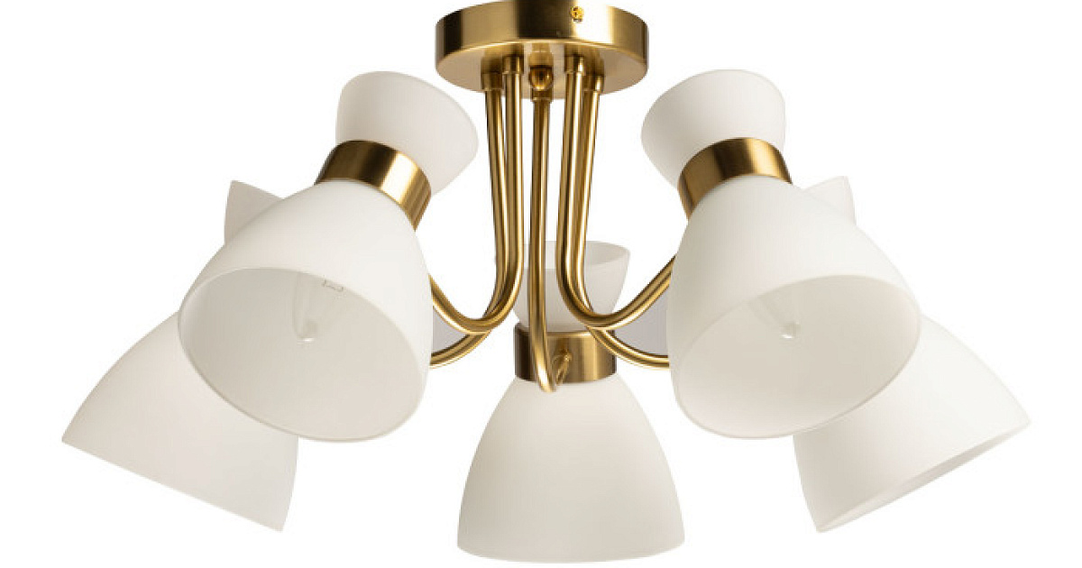 Актуальный цвет латуни придает люстре элегантность и стиль. Особый шарм создают белые стеклянные плафоны, направленные вниз. Компактный размер люстры прекрасно подходит в интерьеры со стандартным потолком. Заменяемые источники света удобны в эксплуатации.
