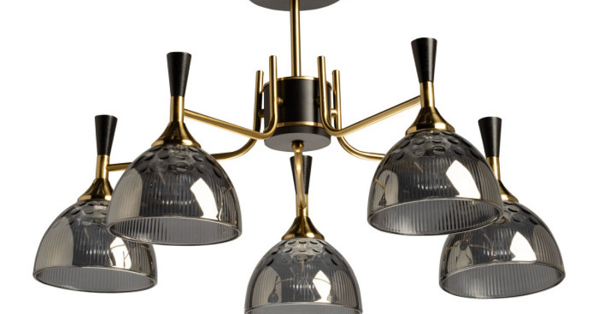 Контрастное сочетание черного и цвета латуни делает потолочную люстру стильным акцентом на потолке. Особое изящество придают люстре стеклянные плафоны с оригинальное текстурой, гальванизированные в дымчатый цвет мягко рассеивают свет и создают уютное освещение. Компактный размер люстры прекрасно подходит в интерьеры со стандартным потолком. Заменяемые источники света удобны в эксплуатации.