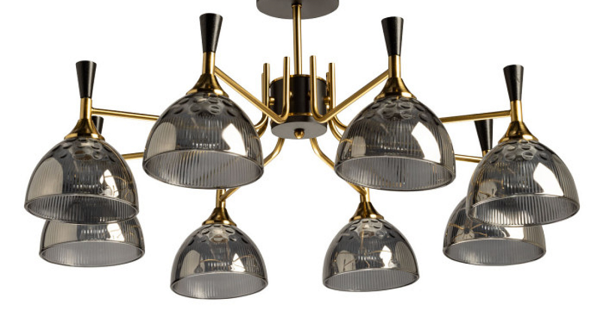 Металлическое основание потолочной люстры гальванизировано в цвет латуни. Отдельные элементы основания окрашены в черный цвет. Плафоны выполнены из фактурного стекла, гальванизированного в дымчатый цвет.