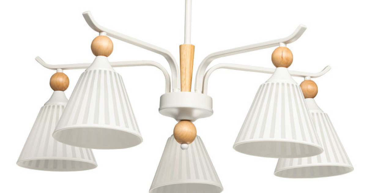 Металлическое основание потолочной люстры окрашено в белый цвет. Стеклянные плафоны отлиты в форму матированы и окрашены в белый. Светильник декорирован элементами из металла цвета натурального светлого дерева.