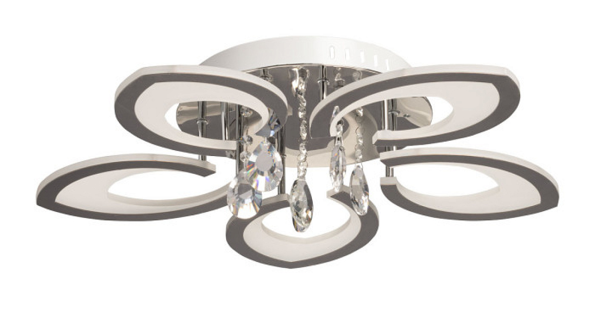 Металлическое основание потолочной люстры гальванизировано в цвет хрома. Светодиодные источники света закрыты белым акрилом. Люстра декорирована пластинами, гальванизированными в цвет хрома и подвесками из прозрачного хрусталя