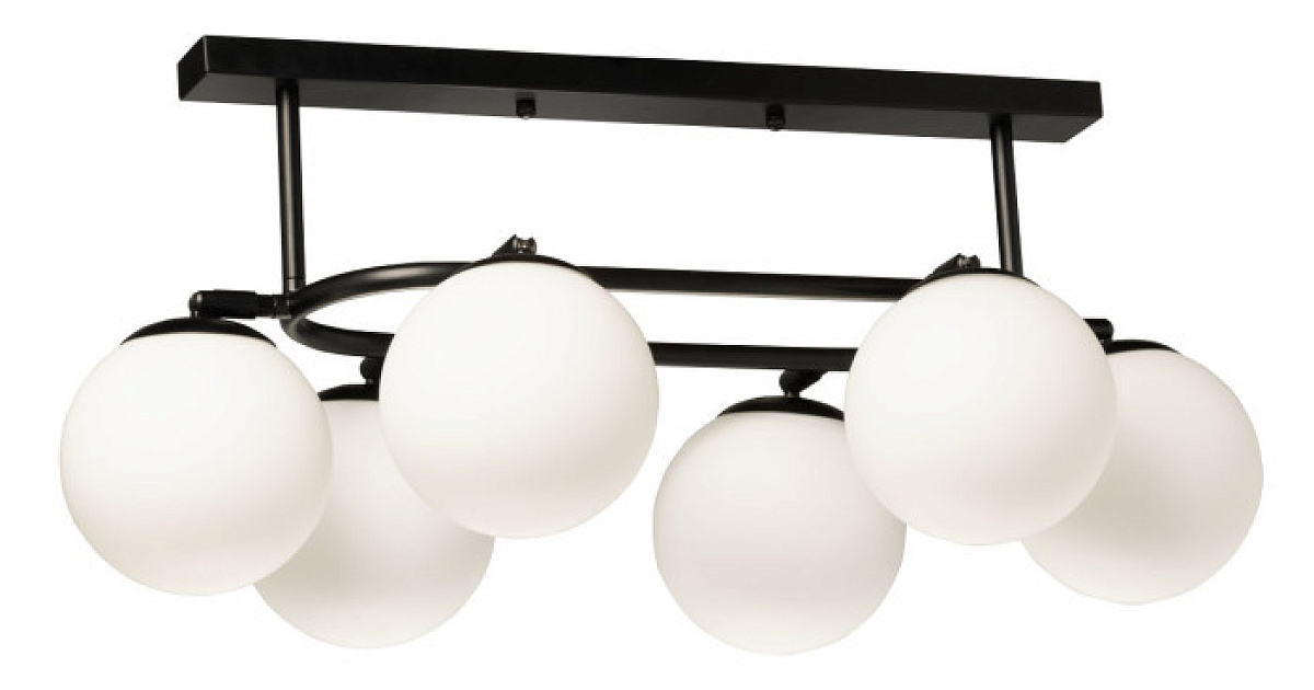 Металлическое основание потолочной люстры окрашено в черный цвет. Светильник декорирован стеклянными плафонами белого матового цвета.