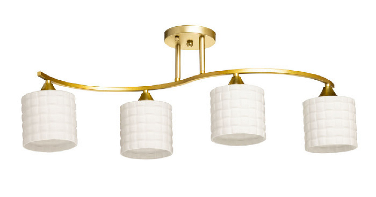 Металлическое основание потолочной люстры окрашено в цвет золота. Стеклянные плафоны отлиты в сложную форму и окрашены в белый цвет.