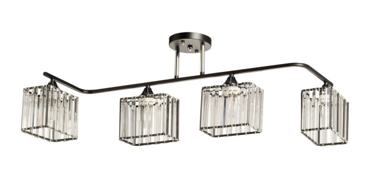Металлическое основание потолочной люстры окрашено в черный цвет. Отдельные элементы основания гальванизированы в цвет хрома. Плафоны декорированы прозрачным стеклом прямоугольной формы.