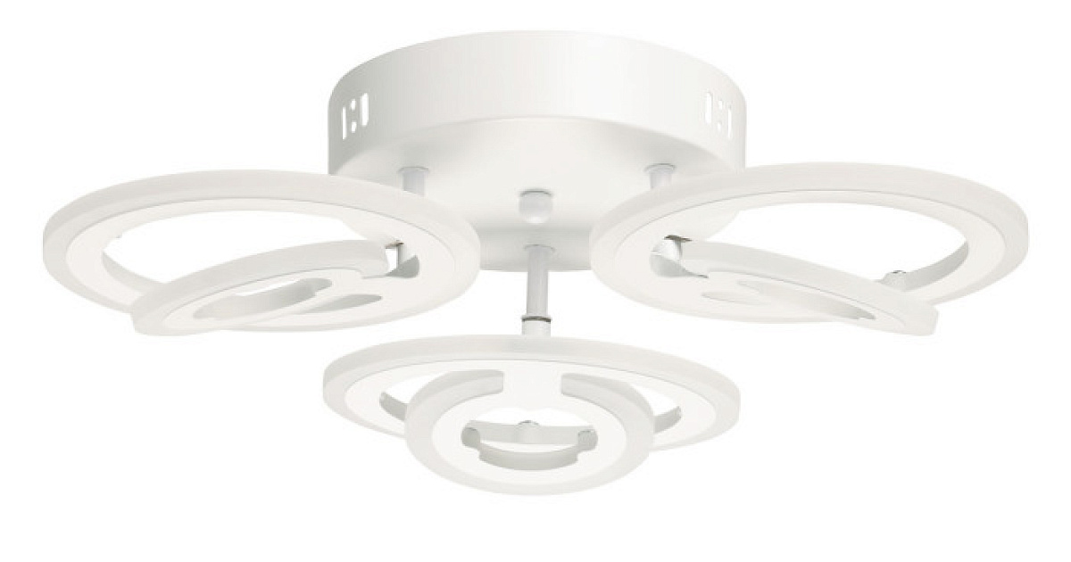 Металлическое основание потолочной люстры окрашено в белый цвет. Корпус плафона выполнен из сплава алюминия с цинком и окрашен в цвет основания. Светодиодные источники света закрыты белым матовым акрилом. Светильник приходит в состоянии частичной сборки в компактной упаковке: вся электрика подсоединена, достаточно закрепить плафоны на корпусе.