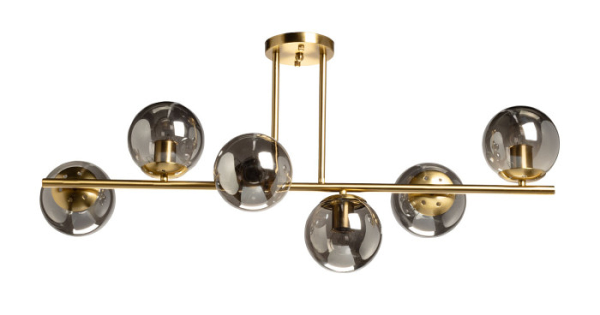 Благодаря сочетанию гальванизированного металла, стекла и золотистых акцентов, люстра привнесет в интерьер неповторимый стиль и атмосферу уюта. Асимметричное расположение стеклянных плафонов придает ей оригинальность и индивидуальность. Дымчатый цвет плафонов создает комфортное мягкое освещение. Светильник вытянут горизонтально, благодаря чему он освещает большую площадь. Заменяемые источники света делают ее удобной в использовании.