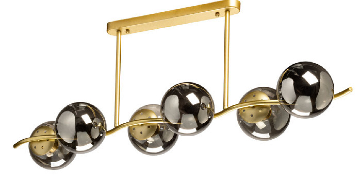Металлическое основание светильника гальванизировано в цвет золота. Светильник декорирован плафонами в виде полусфер из стекла гальванизированного в дымчатый цвет.