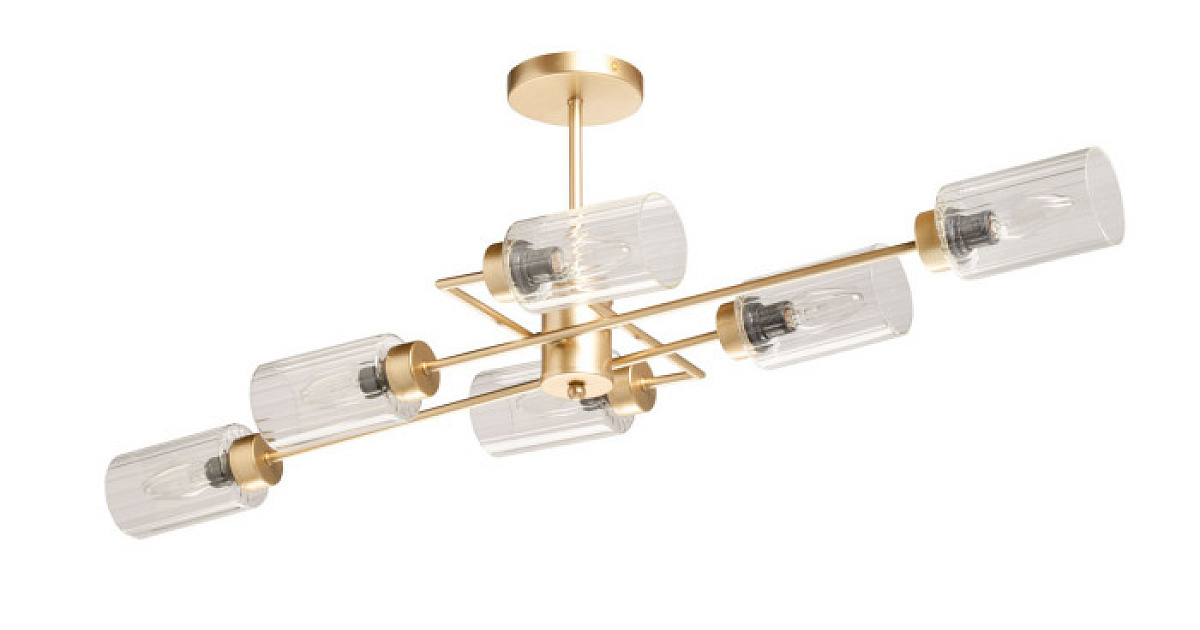 Минималистичный дизайн люстры идеально впишется в современный интерьер, добавляя ему элегантности и стиля. Прозрачные плафоны позволяют свету равномерно распределяться по помещению, создавая приятную атмосферу. Линейная текстура плафонов добавляет игре света дополнительный визуальный эффект. Светильник вытянут горизонтально, благодаря чему он освещает большую площадь. Компактная высота светильника делает его подходящим для помещений со стандартными потолками, не перегружая пространство.
