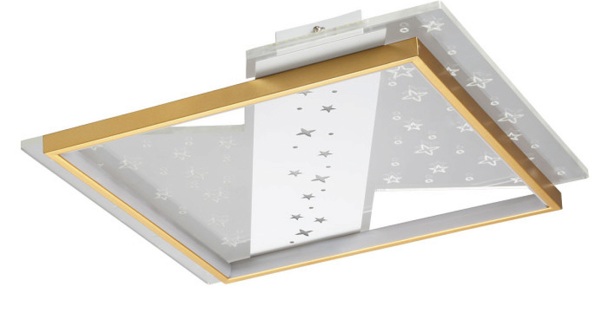 Металлическое основание и плафоны потолочной люстры окрашены в белый цвет и в цвет золота. Светильник декорирован прозрачным акрилом с рисунком звёздного неба. Светодиодные источники света закрыты белым силиконом и матовым акрилом.