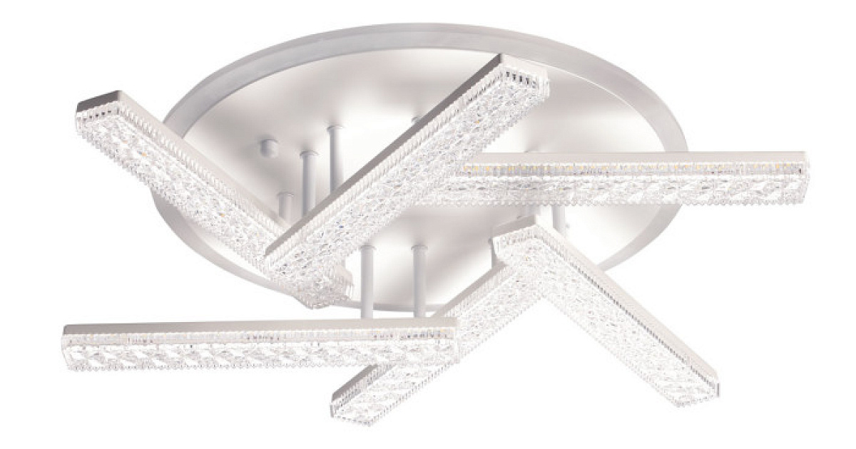 Металлическое основание потолочной люстры окрашено в белый цвет. Светодиодные источники света у потолочной чаши закрыты белым матовым акрилом, на рожках - прозрачным фактурным акрилом.