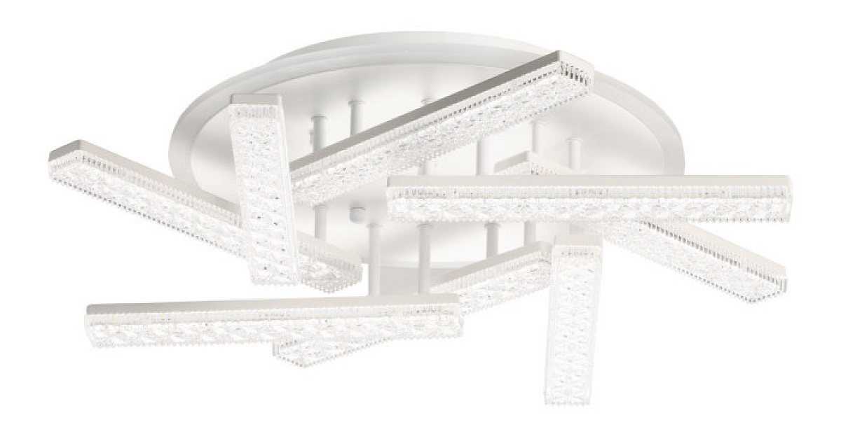 Металлическое основание потолочной люстры окрашено в белый цвет. Светодиодные источники света у потолочной чаши закрыты белым матовым акрилом, на рожках - прозрачным фактурным акрилом.