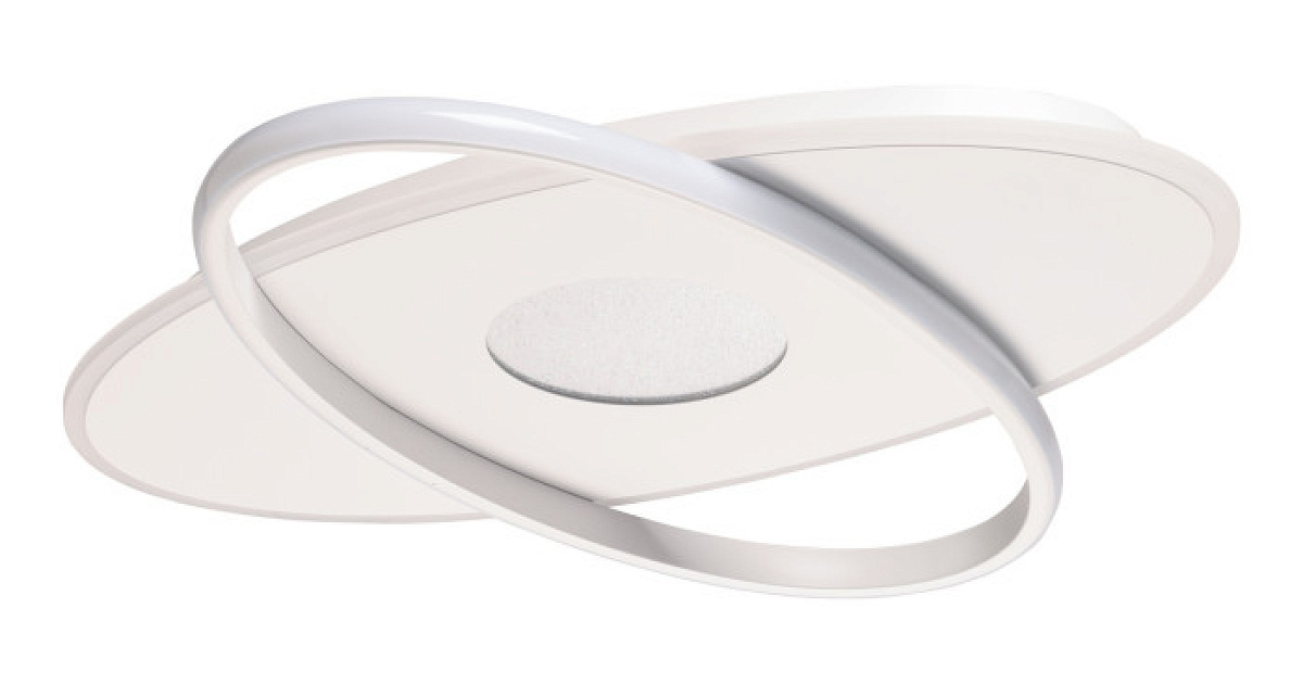 Металлическое основание потолочной люстры окрашено в белый цвет. Светодиодные источники света на основании закрыты матовым акрилом, на плафоне - силиконом белого цвета.