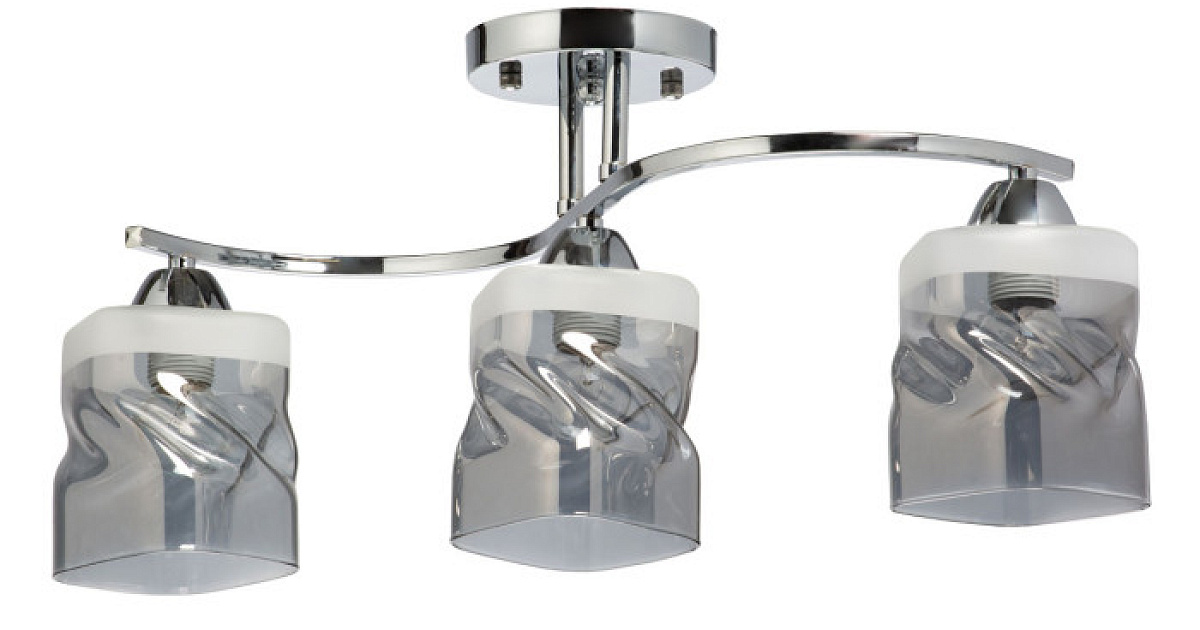 Компактный светильник для небольших помещений. Популярный цвет хрома основания светильника. Цилиндрическая форма плафонов с эффектом неровного стекла дымчатого оттенка как элемент дизайна. Заменяемые источники света удобны в эксплуатации.