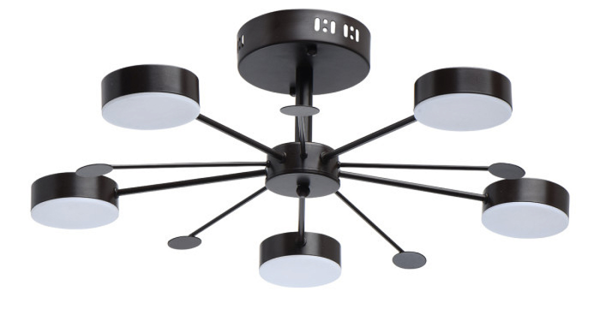 Основание светильника выполнено из металла и окрашено в цвет кофе. Светодиодные источники света закрыты белым матовым акрилом.
