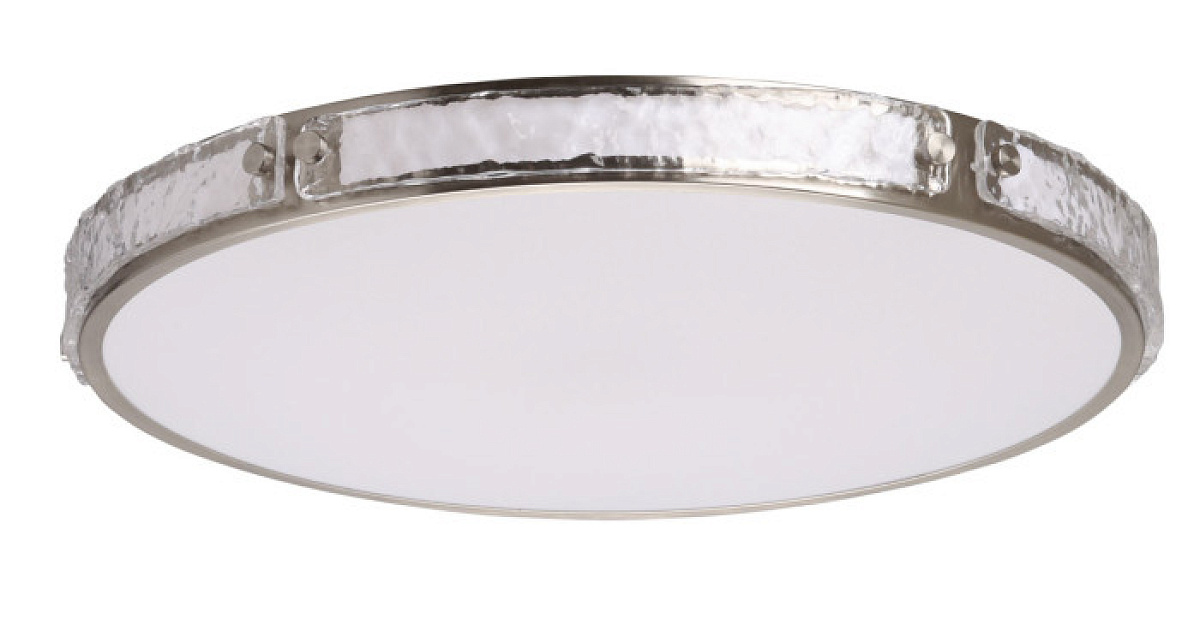 Металлическое основание потолочной люстры гальванизировано в цвет никеля. Светодиодный источник света закрыт белым матовым акрилом. Плафон люстры декорирован прозрачным фактурным стеклом.