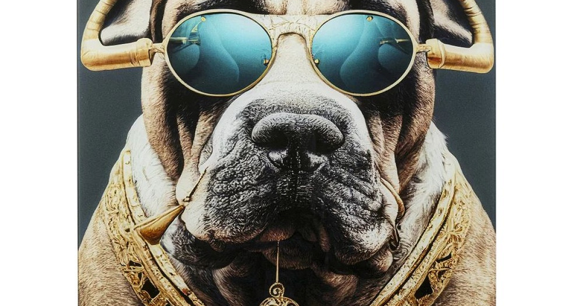 Настоящая находка для любой стены: большое стеклянное изображение собаки в солнцезащитных очках и изысканных украшениях привносит экстравагантность и очарование в любую комнату. Современный, дерзкий внешний вид идеально сочетается с минималистичным или эклектичным интерьером. Идеально подходит для использования в качестве центральной точки на стене галереи или в качестве яркой подсветки над буфетом. Привлекательный элемент, который привносит яркую свежесть как в гостиную, так и в прихожую.