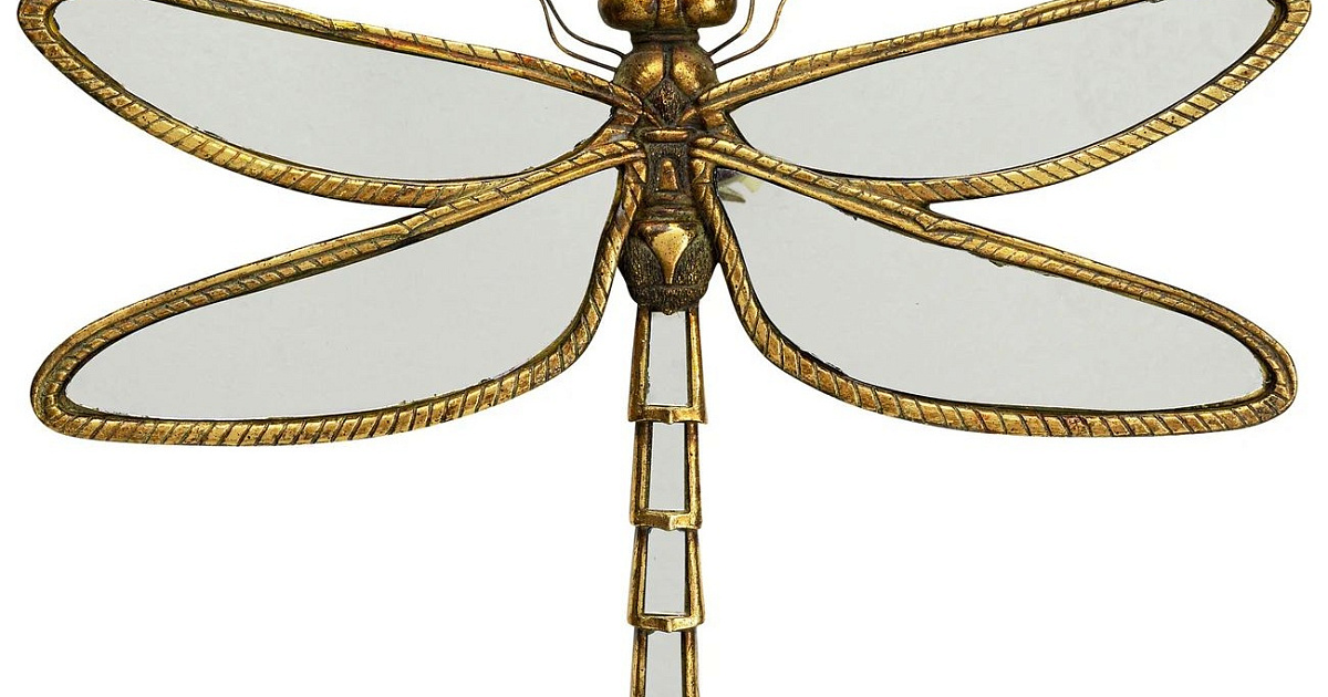 Большой декоративный зеркальный предмет в виде красивой стрекозы.