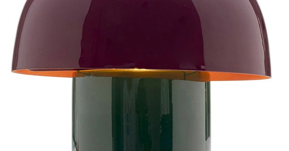 Маленькая настольная лампа фиолетово-зеленого цвета в форме гриба.