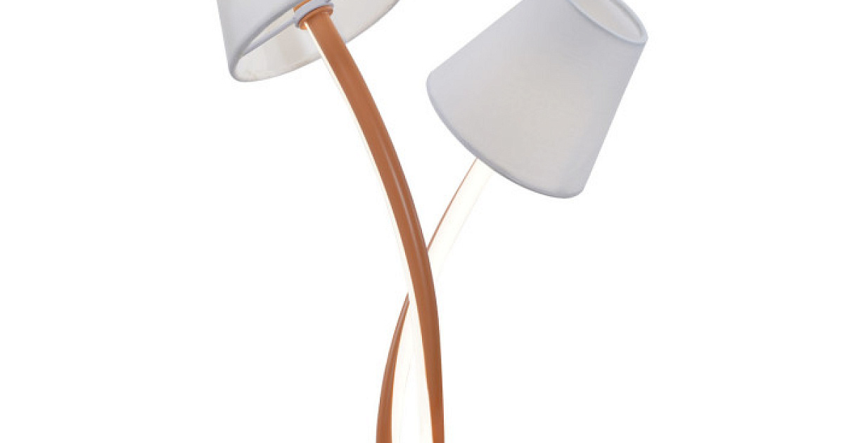 Металлическое основание настольной лампы окрашено в терракотовый цвет. Корпус плафонов изогнутой формы выполнен из сплава алюминия с цинком и окрашен в цвет основания. Двухслойные абажуры состоят из текстиля белого цвета и термостойкого акрила с внутренней стороны. Абажуры прошиты. Светодиодные источники света закрыты белым силиконом.